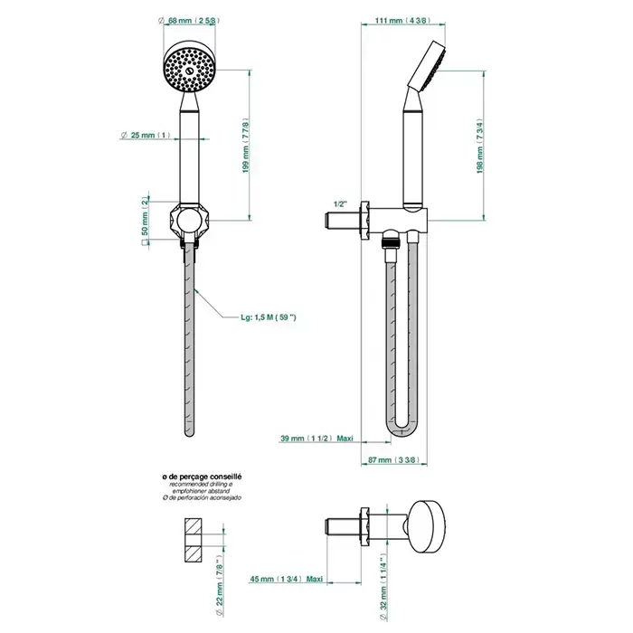 THG Nihal Porcelaine Ivoire Душевой комплект с ручным душем, держатель с подводом воды и шланг 1500 мм., цвет: Soft gold