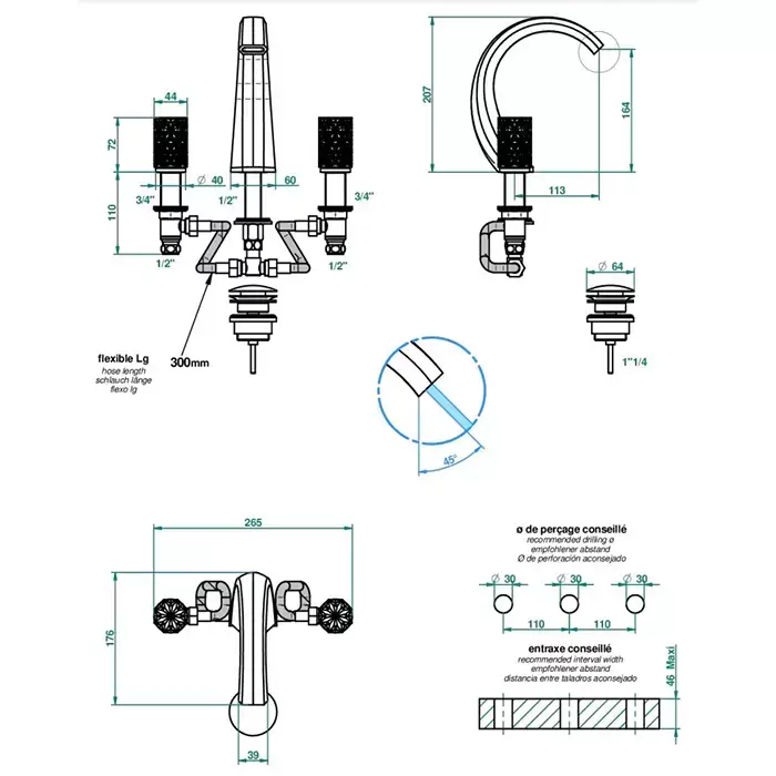 THG Nihal Porcelaine Noire Смеситель для раковины на 3 отверстия, с донным клапаном, цвет: Aranja (black nickel)