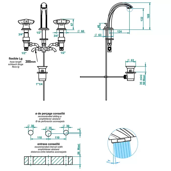 THG Oceania Смеситель для раковины, 3 отв., цвет: золото/прозрачный хрусталь