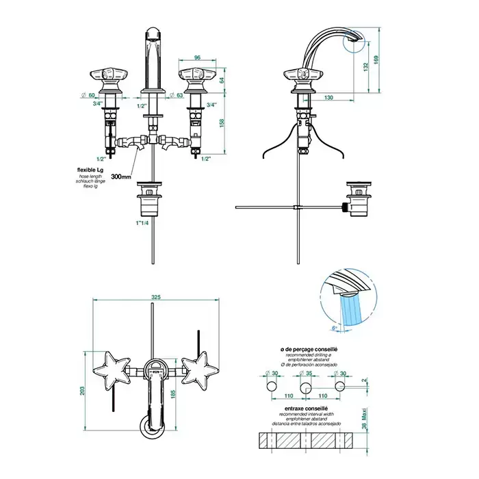 THG Oceania Смеситель для раковины на 3 отверстия, ручки с подсветкой, с донным клапаном, цвет: хром