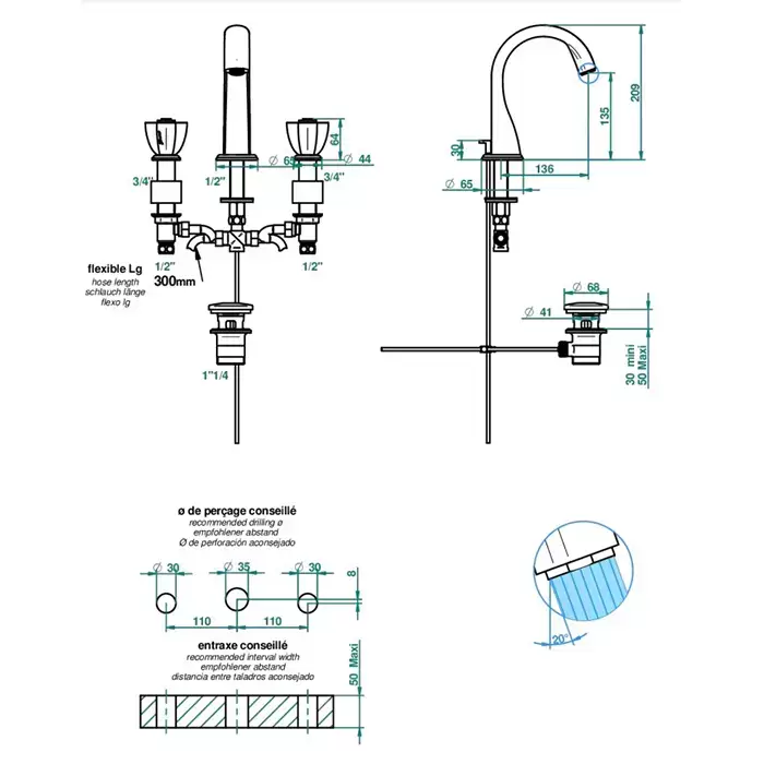 THG Petale de Cristal rouge Смеситель для раковины на 3 отверстия, с донным клапаном, цвет: полированное золото
