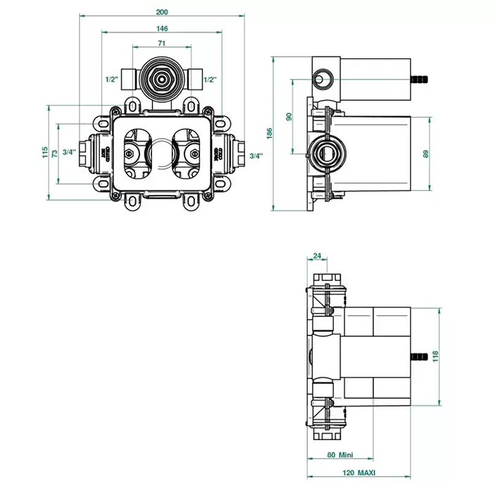 THG Термостат 3/4" - 60 л/мин с восковым картриджем и коробкой для встраивания, для двух потребителей