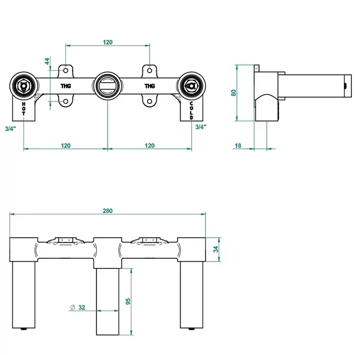 THG Встраиваемая часть смесителя настенного на 3 отверстия на пластине (рукоят.) cross handle version