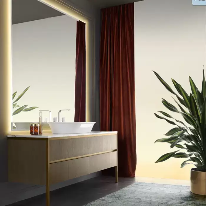 VITAGE milldue edition ALGONQUIN Комплект мебели с базой, раковиной NEW YORK, мраморной столешницей, зеркалом BROOKLYN с подсветкой, 166см, матовый шпон/аллюминий, напольная, Цвет: rovere miele-7676/ottone spazzolato-339/arabescato-B15