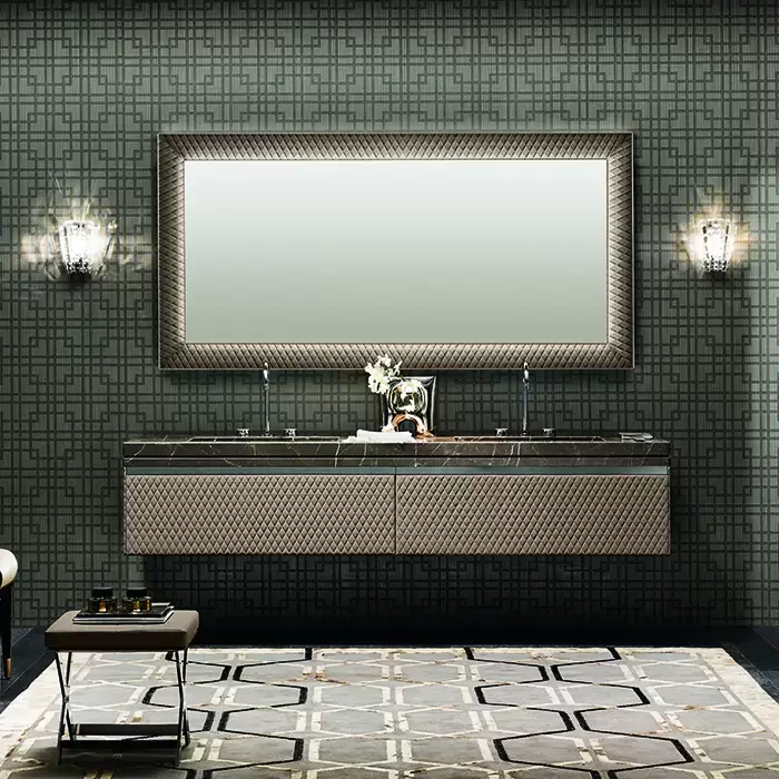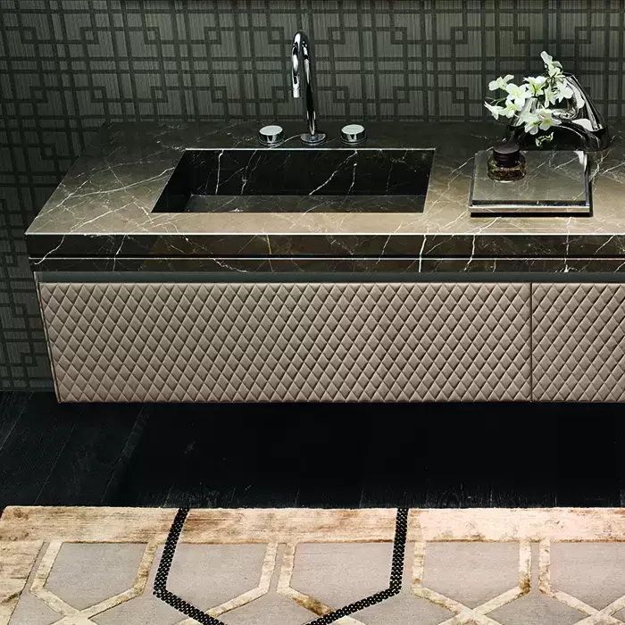 VITAGE milldue edition FOUR SEASONS Комплект мебели с базой, интегрированными раковинами PLANS, зеркалом LOSANNA, 216см, подвесной, цвет: мрамор bronzo amani-B58 экокожа visione-223 черный хром
