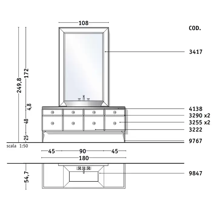 VITAGE milldue edition MAJESTIC Комплект мебели с базой 180см, раковиной NIZZA, зеркалом GINEVRA и светильниками, напольная, ручки золото Цвет: mandorla-13/золото