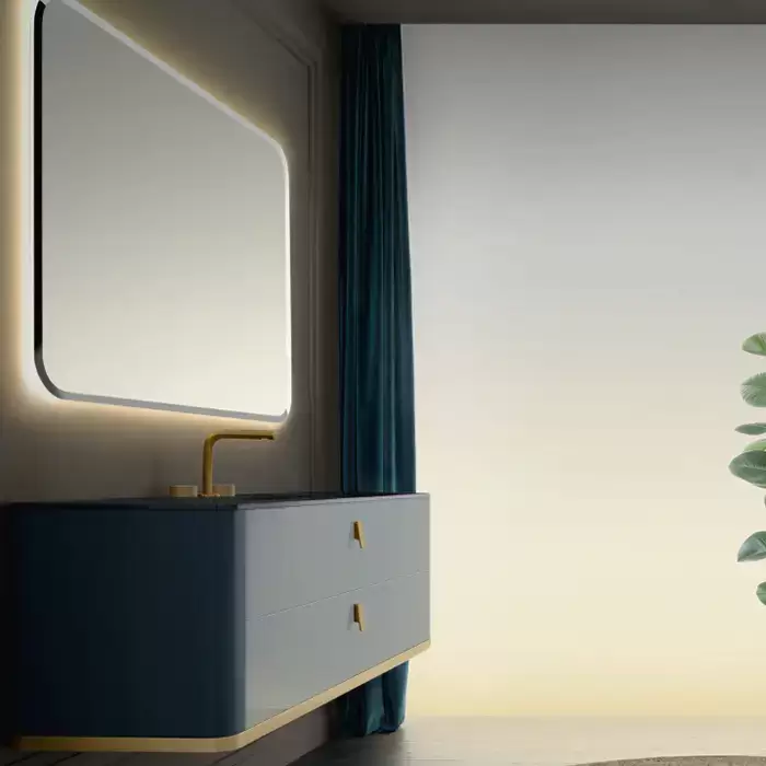 VITAGE milldue edition TAILOR Комплект мебели с базой, ручки сатинированное золото, интегрированной стеклянной раковиной ASPEN, зеркалом BEND с подсветкой, 141см, лак высокий глянец, подвесной, Цвет: zaffiro-137
