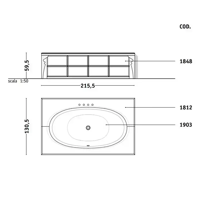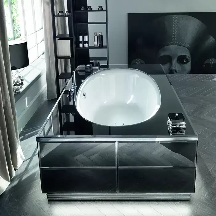 VITAGE milldue edition Ванна 190х100см, стальная, подача воды из водослива, в комплекте с сифоном, основанием и зеркальным топом, отдельностоящая, цвет: белый/Fumè