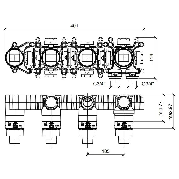 Almar Modular Встраиваемая часть термостатического смесителя с переключателем на 2 положения, горизонтальный модуль, цвет: черный матовый
