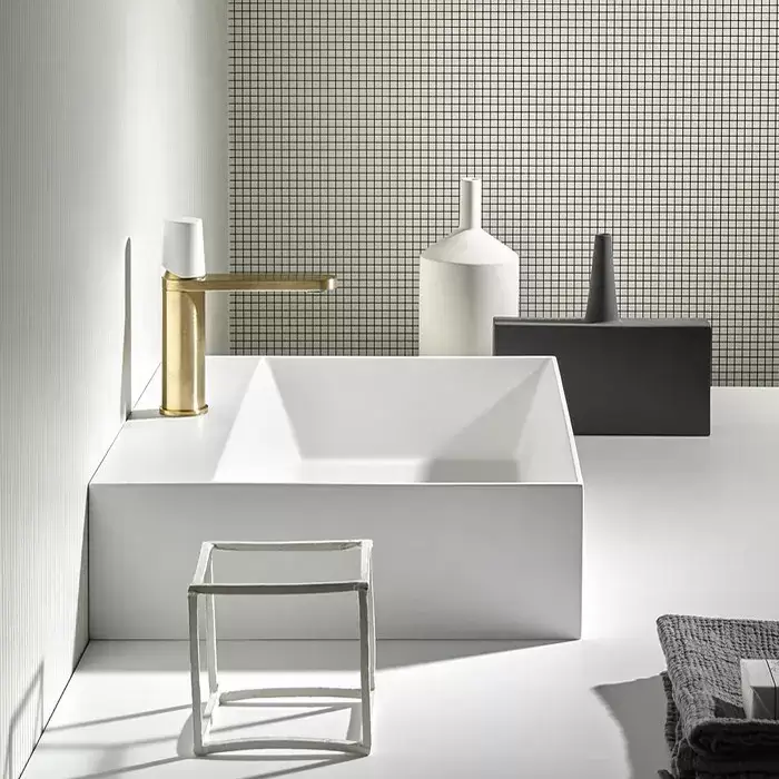 ANTONIO LUPI INDIGO Смеситель для раковины на 1 отверстие, излив 165 мм., ручка белая матовая, цвет: сатинированная натуральная латунь