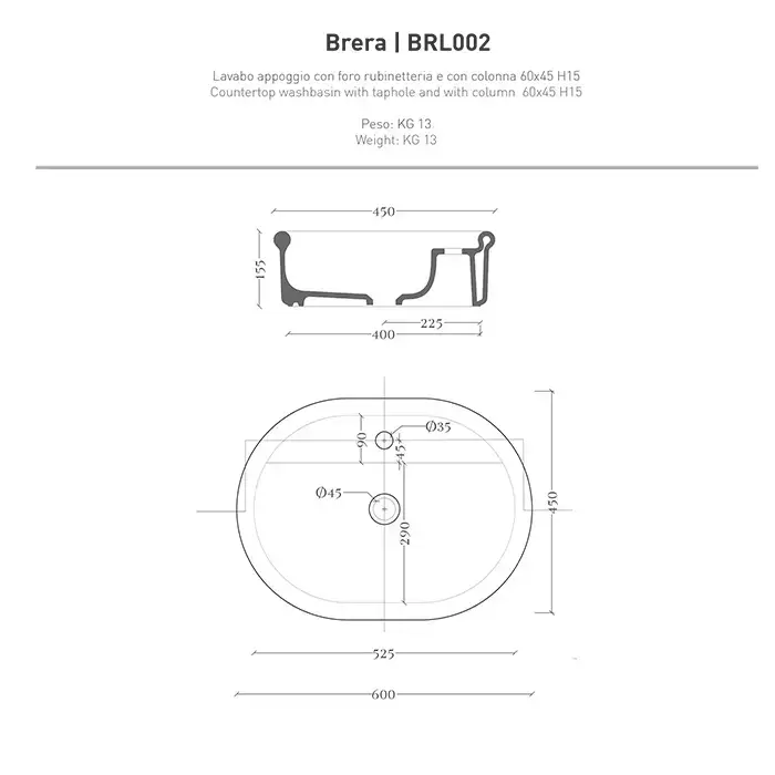 Artceram Brera Раковина 60х45х15.5см., накладная, без отв., цвет: белый глянцевый