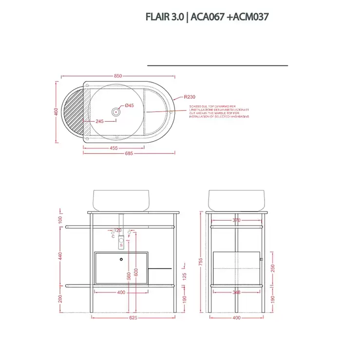 Artceram Flair 3.0 Металлическая консоль с раковиной, 85х46х75.5см., напольная, с выдвижным ящиком и мраморной столешницей, цвет: moka/verde salvia