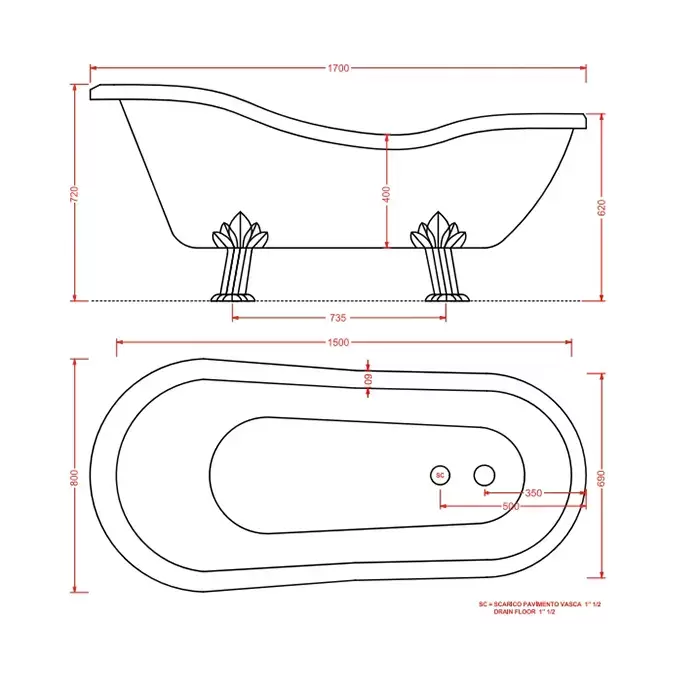 Artceram HERMITAGE Ванна отдельностоящая, 170x80x72см., на лапах, со слив-переливом и сифоном в компл. цвет: ванны белый, ножки хром