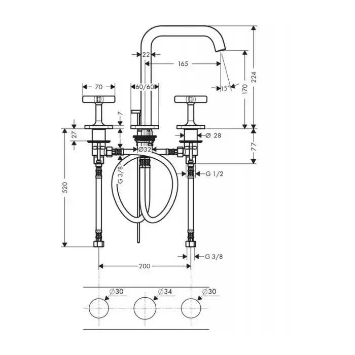 Axor Citterio E, Смеситель для раковины 170, на 3отверстия, с розетками и доннымклапаном, цвет: хром