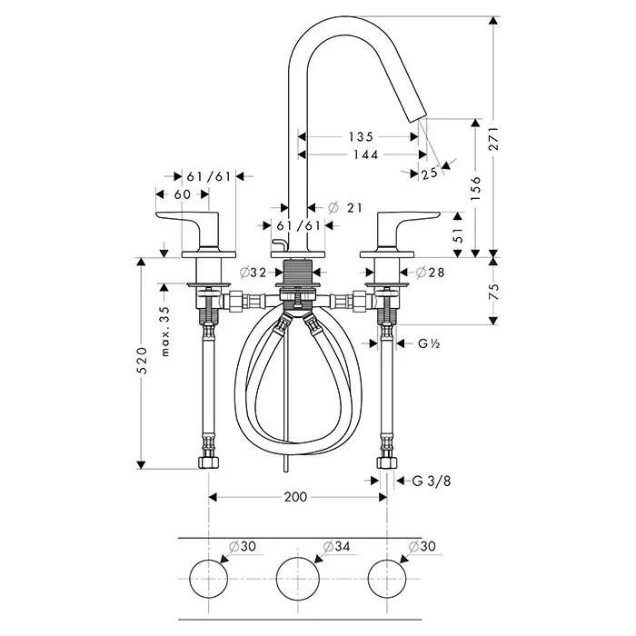 Axor Citterio M Смеситель для раковины, на 3 отв., излив: 13.5см, с донным клапаном, цвет: полированное золото