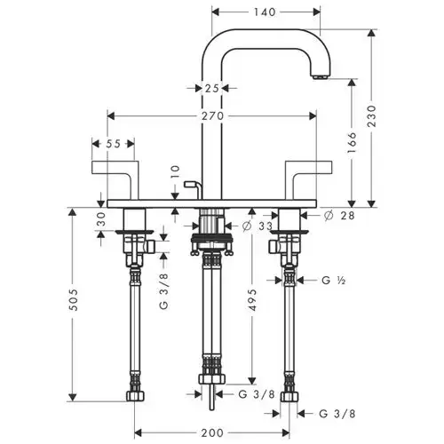 Axor Citterio, Смеситель для раковины, на 3отверстия 170, с рычаговымирукоятками, панелью и изливом, цвет: хром
