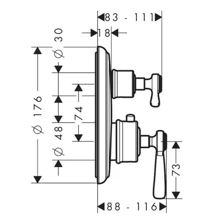 Axor Montreux, Термостат с запорным/ переключающим вентилем, с рычаговой рукояткой, СМ, внешняя часть, цвет: никель шлифованный