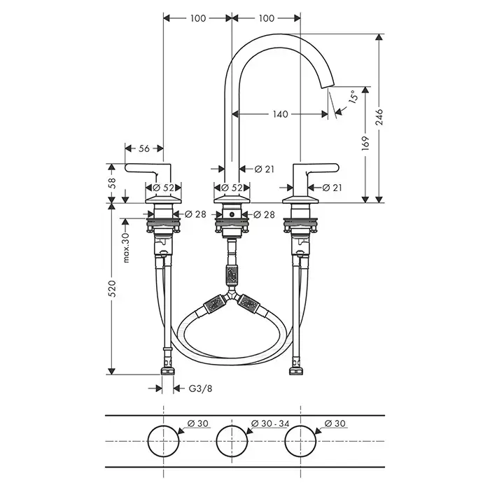 Axor One Смеситель для раковины 170, на 3 отв., с донным клапаном Push-Open, цвет: полированное золото