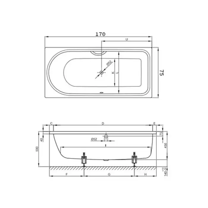 Bette Ocean Ванна с шумоизоляцией пристенная, 170х75х45см, перелив спереди, BetteGlasur® Plus, антислип, с комплетом ножек, цвет: белый