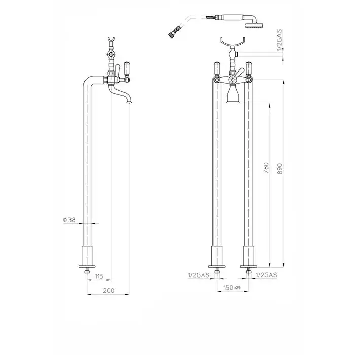 Bossini Liberty Смеситель для ванны, напольный, высота 890 мм, Душевая лейка Libertyцвет:Gom и шланг дв. фальцевание латунь, 150 см ½”FF, цвет: хром
