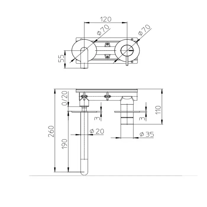 Bossini Nobu Смеситель настенный, на 2 отверстия, с изливом 190 mм, без донного клапана, цвет: нержавеющая сталь