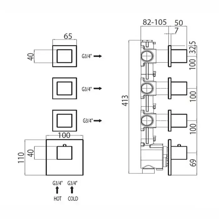 Bossini Rectangular Термостат для душа, встраиваемый, с девиаторм/запорным вентилем на 3 - 6 выходов, уст-ка верт/гор., цвет: хром