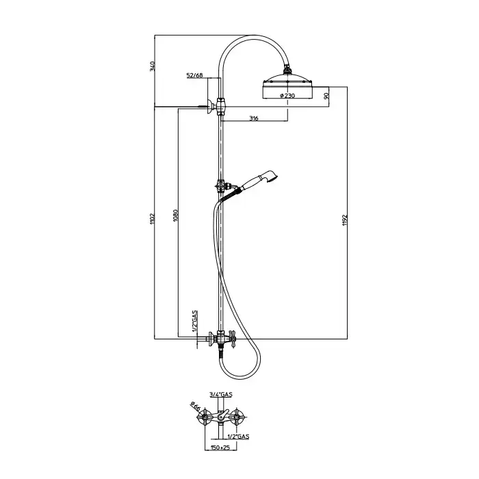 Bossini Retro Душевая стойка с верхним душем Ø23см., ручным душем и шлангом 150см., цвет: хром
