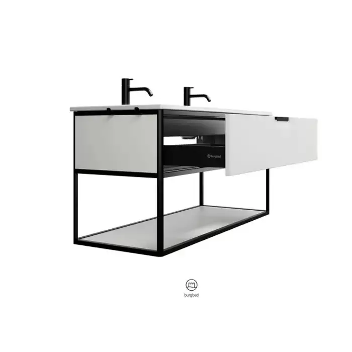 Burgbad Vry Комплект мебели 1230х496х600 мм, подвесной, 1 ящик, 1 полка, раков белая глянц с 2 отв для смес, ручка G0253, цвет белый матовый