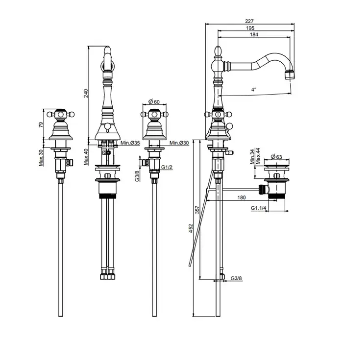 Carlo Frattini Elizabeth Смеситель для раковины, на 3 отв., с донным клапаном, цвет: золото