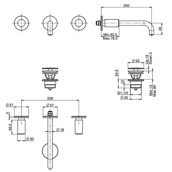 Carlo Frattini So Смеситель для раковины настенного монтажа, на 3 отв, излив 200 мм, донный клапан click-clack, цвет: хром