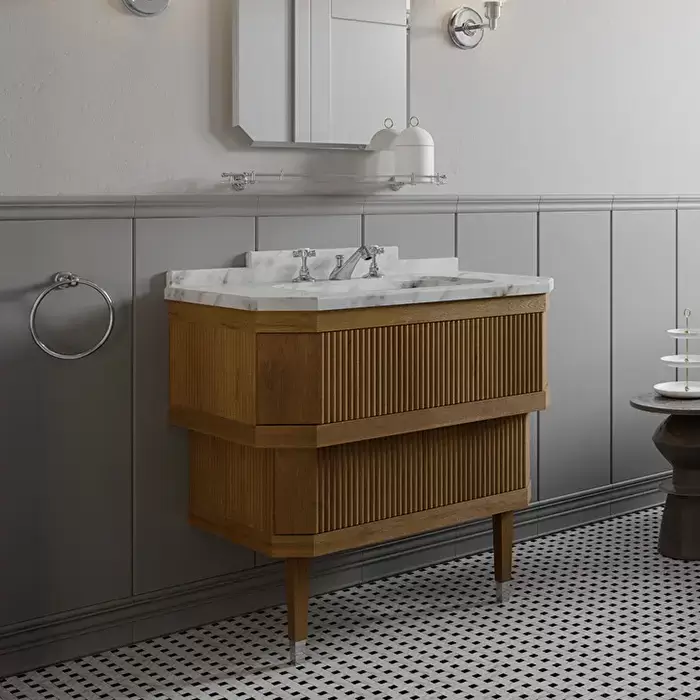 Devon&Devon Metropolitan Essenc Тумба под раковину из дуба 88.5х95 см, стол. BIANCO CARRARA, рак. SWINDON на 3 отв белая , ножки хром, цвет: ROVERE