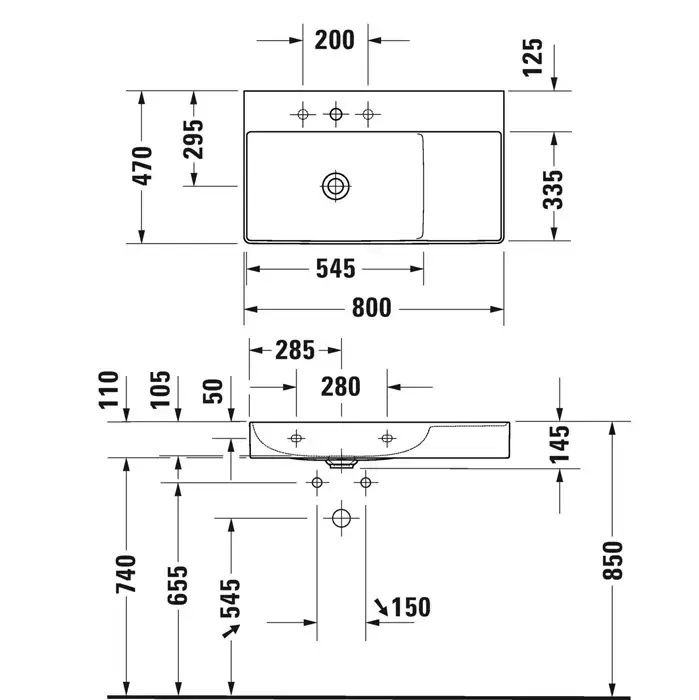 Duravit DuraSquare Раковина подвесная 80х47см, Sx, с отметками на 2 отв., с покрытием WonderGliss, без перелива, цвет: белый