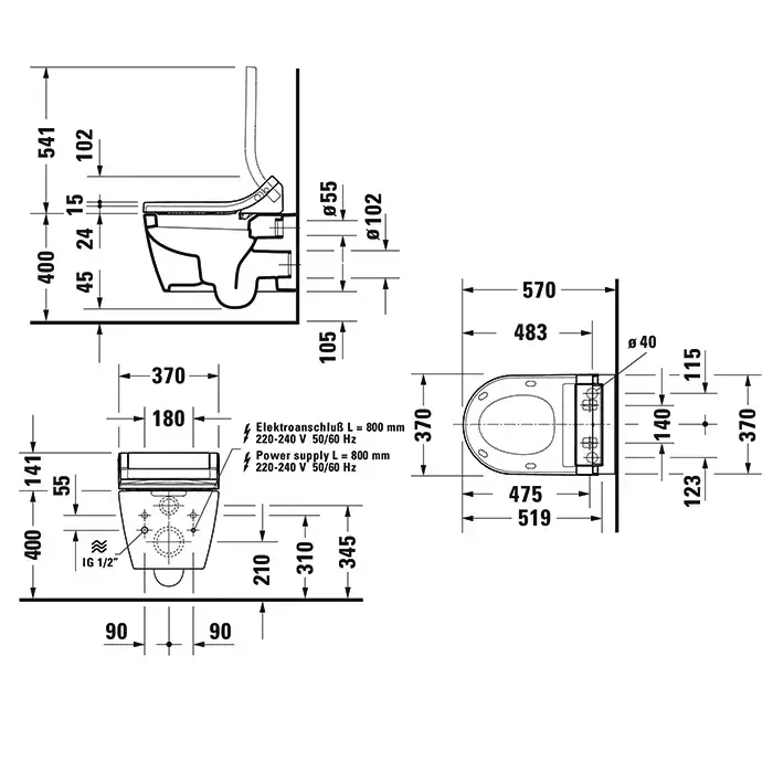Duravit ME by Starck SensoWash Унитаз подвесной, вкл. крепление Durafix, включая компоненты для SensoWash со скр. подкл, 4,5л, 37х57см., цвет: белый