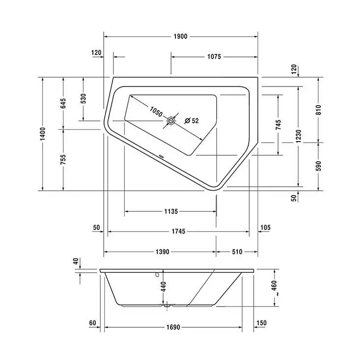 Duravit Paiova 5 Ванна угловая 190х140х46см, Sx, встраиваемая, с 2 разными наклонами спинки, цвет: белый