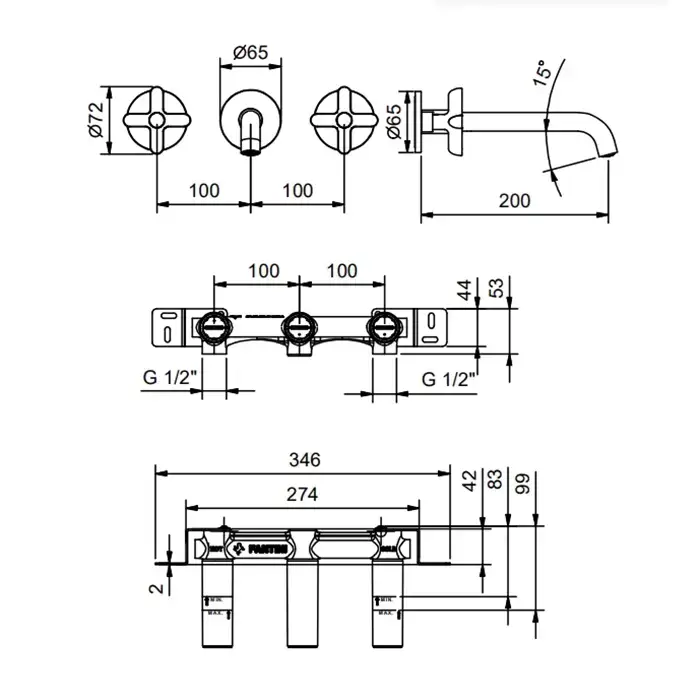 Fantini Icona Classic Смеситель для раковины, встраиваемый, на 3 отв, без дон.клапана, излив 200мм (наружняя часть), цвет: черный матовый