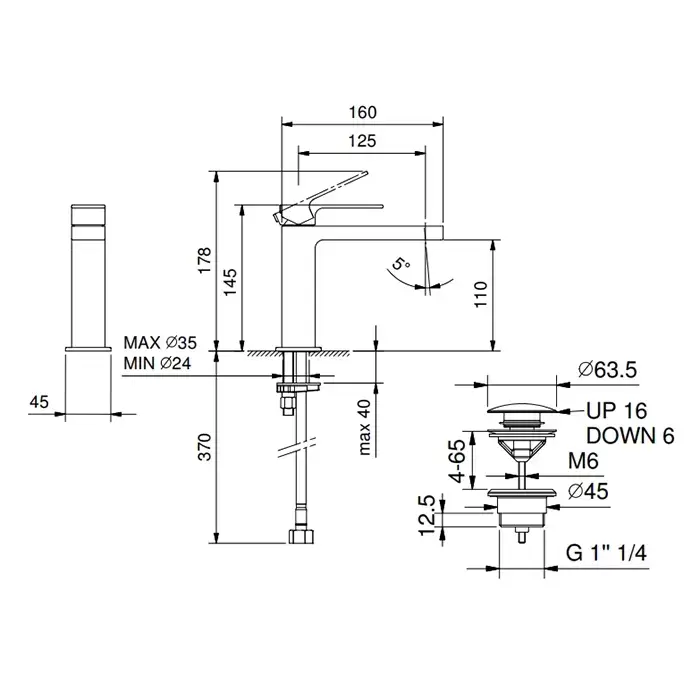 Fantini Mint Смеситель для раковины, на 1 отв., однорычажный, излив 12.5см., с нажимным донным клапаном, цвет: черный матовый