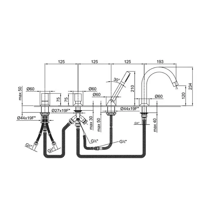 Fantini Nostromo Смеситель на борт ванны, 4 отв., с ручн душем, излив 19.5см, цвет: черный матовый