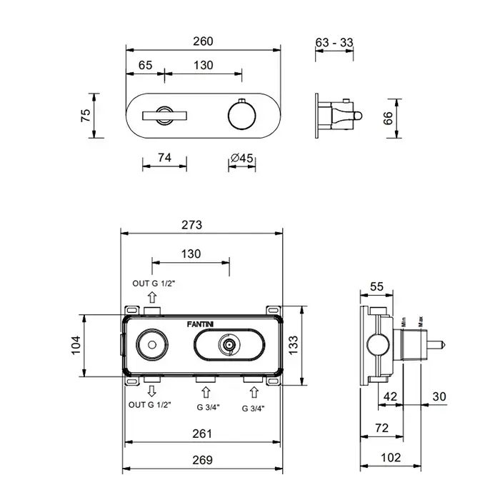 Fantini Sailing Смеситель для душа, встраиваемый, термостатический, с переключателем на 2 положения, внешняя часть, цвет: Deep Black PVD