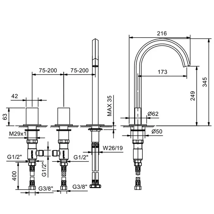 Fantini Venezia Смеситель для раковины, 3 отв., высокий излив, излив: 175 мм, цвет: Matt British Gold PVD