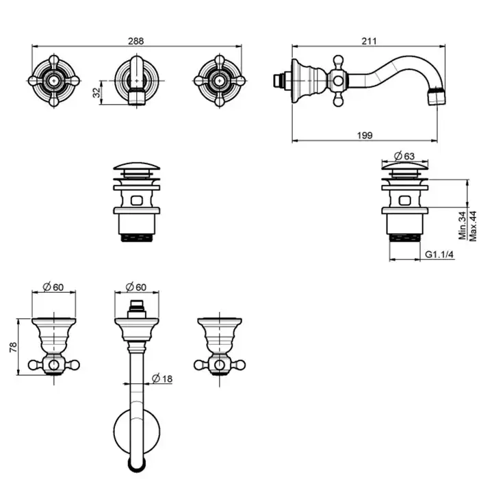 Fima Carlo Frattini Elizabeth Смеситель для раковины настенный монтаж, на 3 отв, излив: 20см., донный клапан click-clack, цвет: бронза