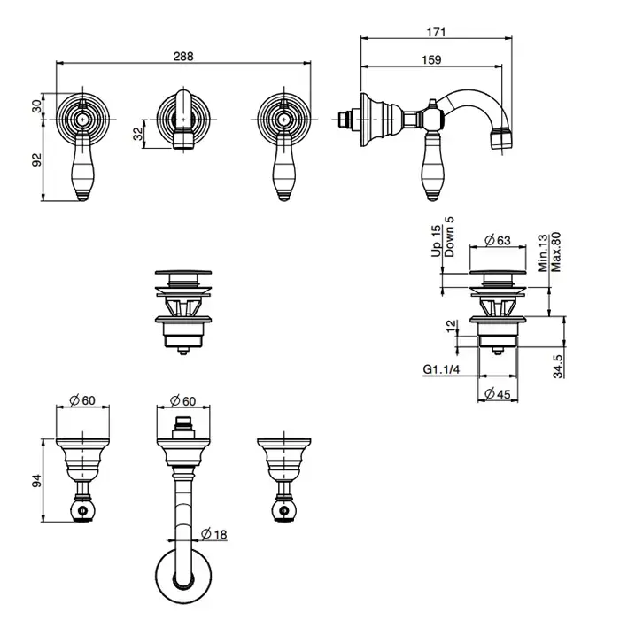 Fima Carlo Frattini Herend Смеситель для раковины, встраиваемый, излив: 15.9см., черные ручки, цвет: хром