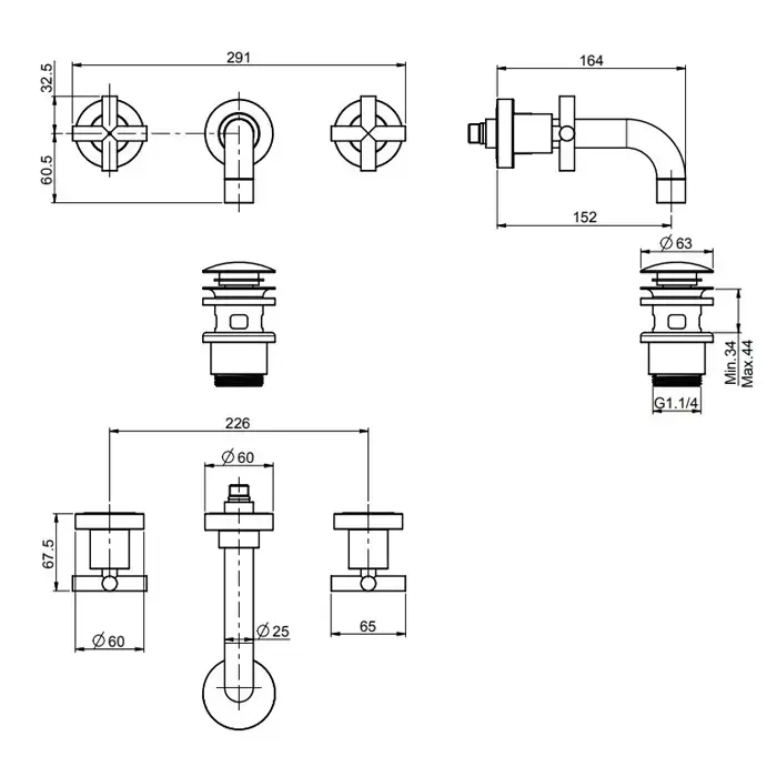 Fima Carlo Frattini Maxima F5321/5NS Смеситель для раковины настенный, на 3 отверстия, излив 150 мм., донный клапан click-clack, внутренняя часть (F2230) в комплекте, цвет: черный матовый