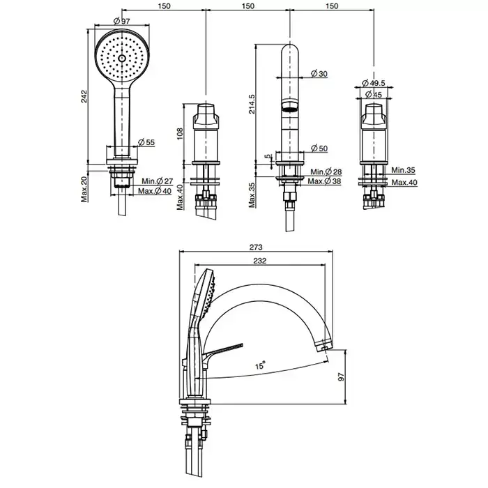 Fima Carlo Frattini Serie 4 Смеситель на борт ванны, на 4 отв., с ручным душем, цвет: хром