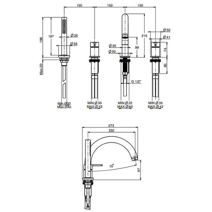 Fima Carlo Frattini Snap Смеситель на борт ванны, на 4 отв., с ручным душем, цвет: черный матовый