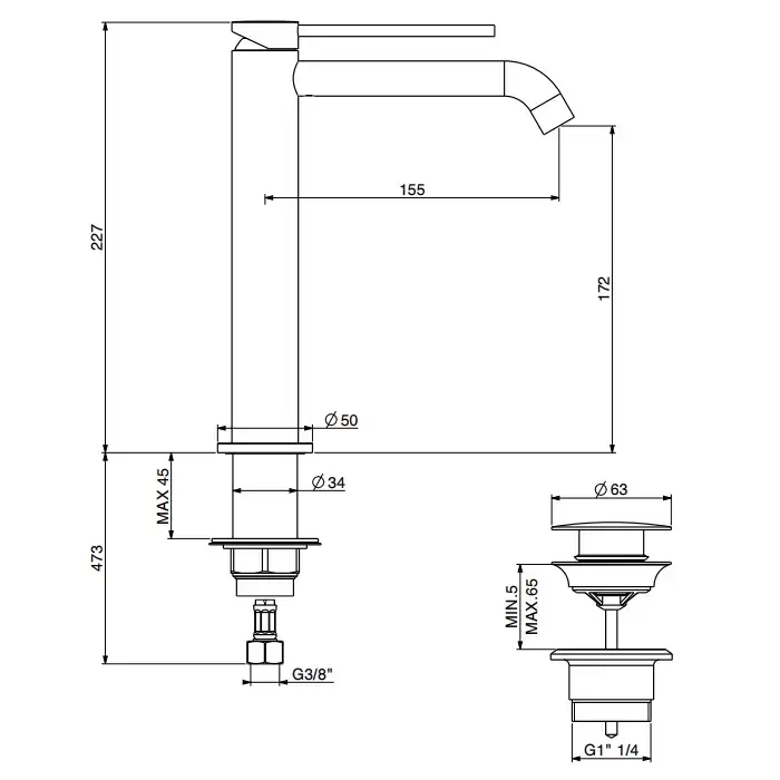 GATTONI CIRCLE TWO Смеситель для раковины высокий 227 мм, на 1 отверстие, излив 155 мм, с донным клапаном, цвет: хром