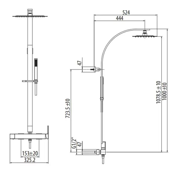 Gattoni ELY Смеситель для душа с колонной, верхний душ 250х250 мм, с ручным душем, цвет: хром