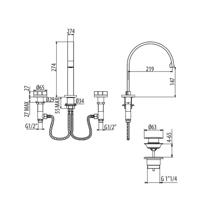 Gattoni GAS Смеситель для раковины, на 3 отв., в комплекте с донным клапаном, цвет: Gold 24KT