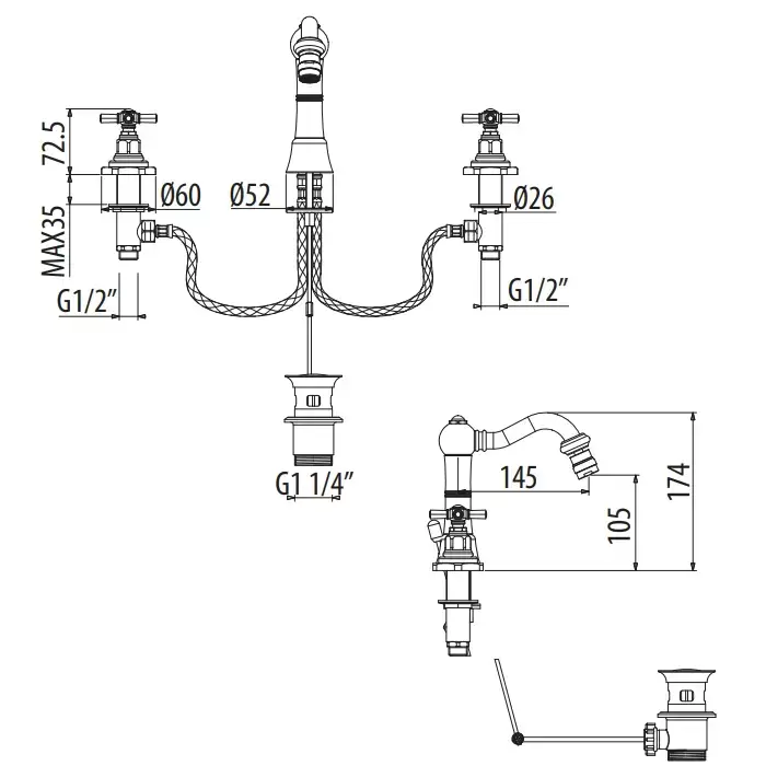 Gattoni TRD Смеситель для биде, 3 отв., ручки Paris, цвет: хром