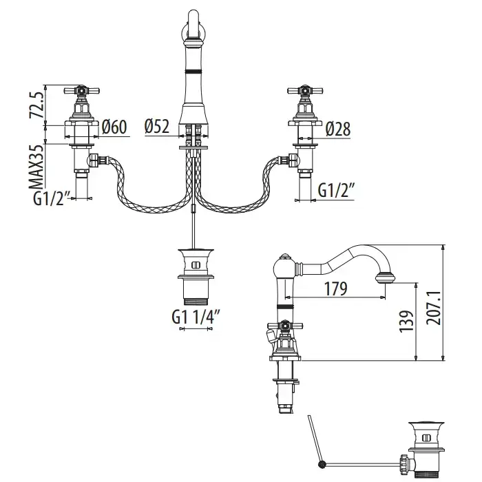 GATTONI TRD Смеситель для раковины на 3 отверстия, ручки Paris, высота излива 139 мм., с донным клапаном, цвет золото 24 К