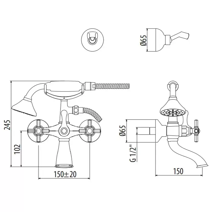 Gattoni TRD Смеситель для ванны, настенный, с ручным душем и шлангом, настенный держатель, ручки Paris, цвет: золото 24К